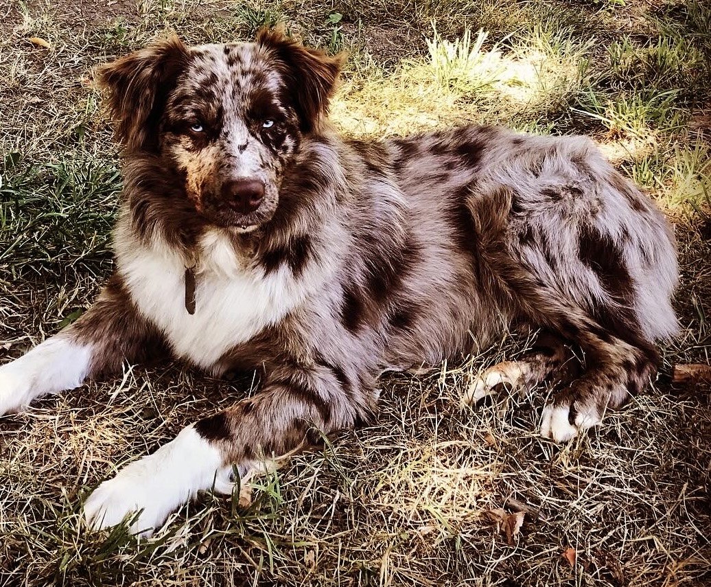 Ruger is our amazing red merle stud with blue/amber merle patterns in both eyes. He is a giant teddy bear of a boy who loves snuggles, cats, and sleeping on hay piles! Ruger is ASCA/AKC registered, stands 23 inches at the withers and weighs a solid, lean 70lbs. Ruger has also passed all OFA testing (hips/elbows/eyes) and is 100% genetically clear via Orivet. His gentle personality and large structure are passed onto his puppies, along with his minimal white signature look.